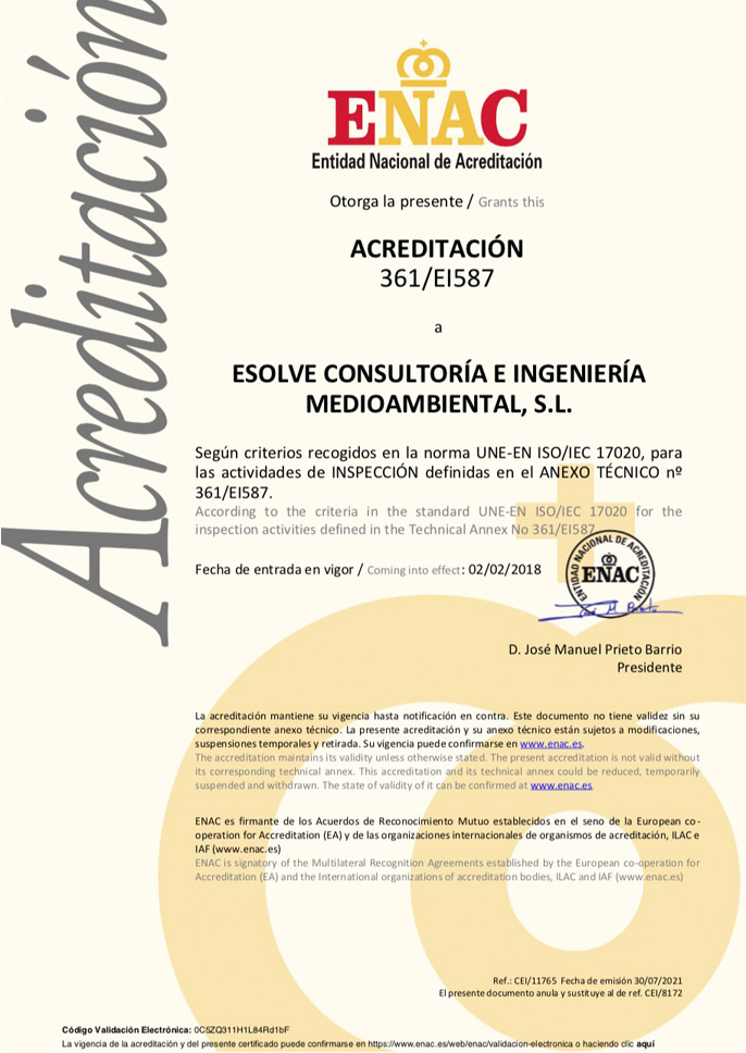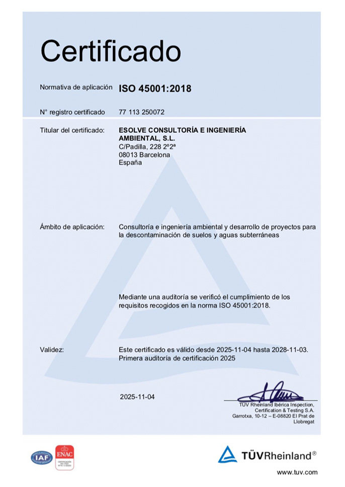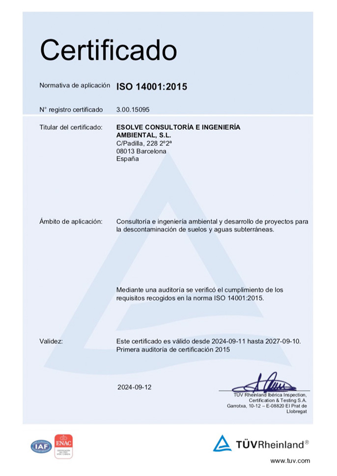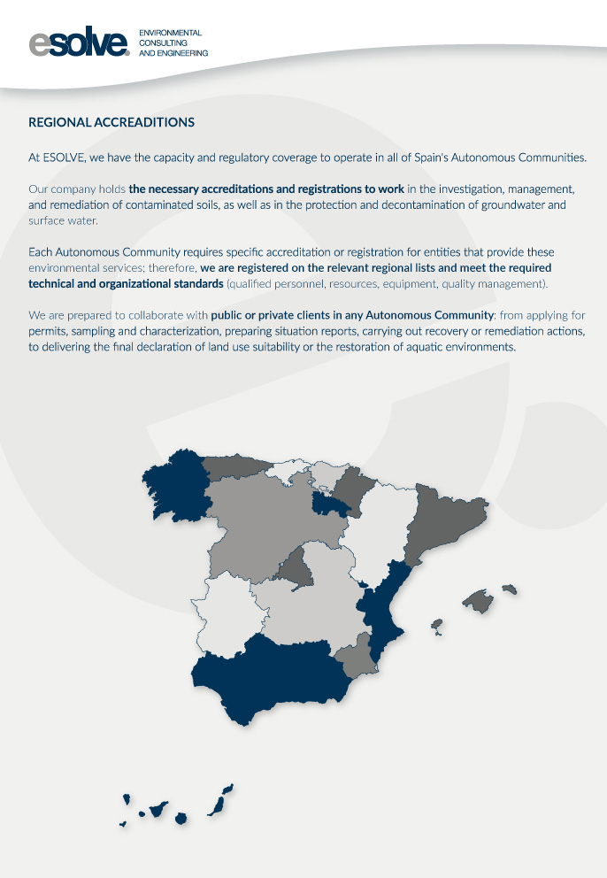 At ESOLVE we work with the utmost technical rigor and under the umbrella of excellence. We have the necessary official accreditations and certifications to practice in Spain, in addition to the corresponding qualification to work in those Autonomous Communities that request a specific registration as an entity recognized by the Administration, all this, to offer services such as consultancy and environmental engineering specialized in soil decontamination and contaminated water treatment.